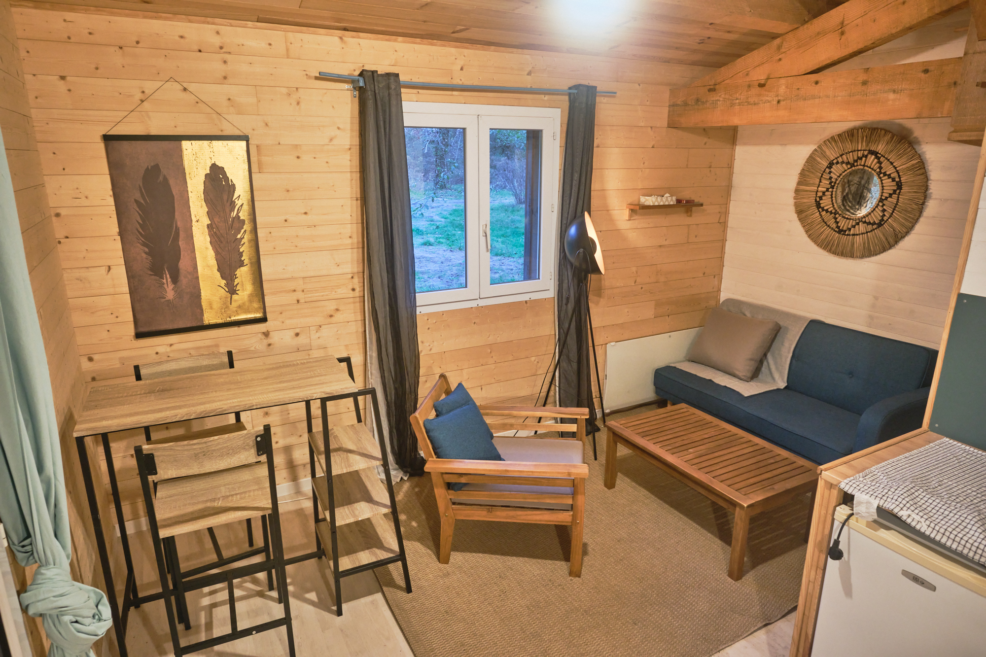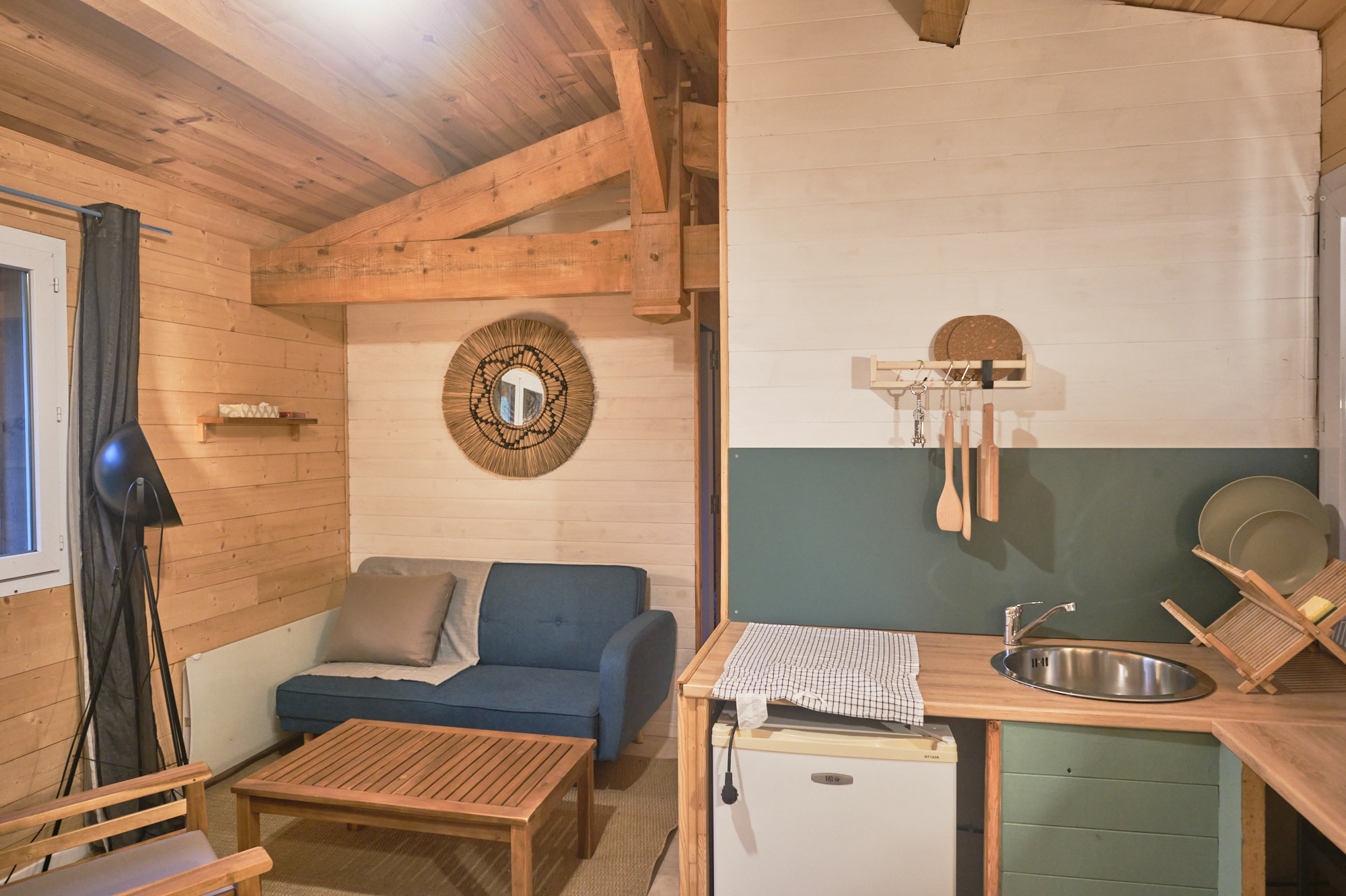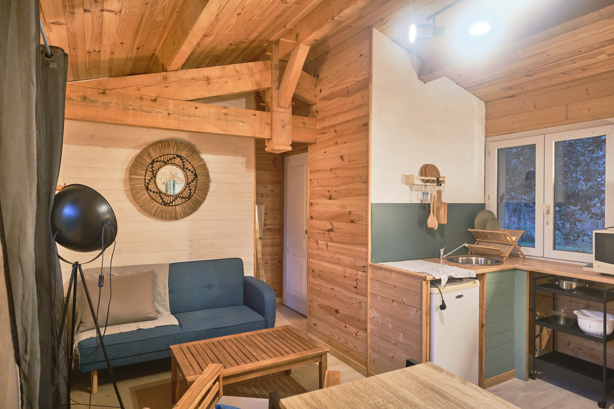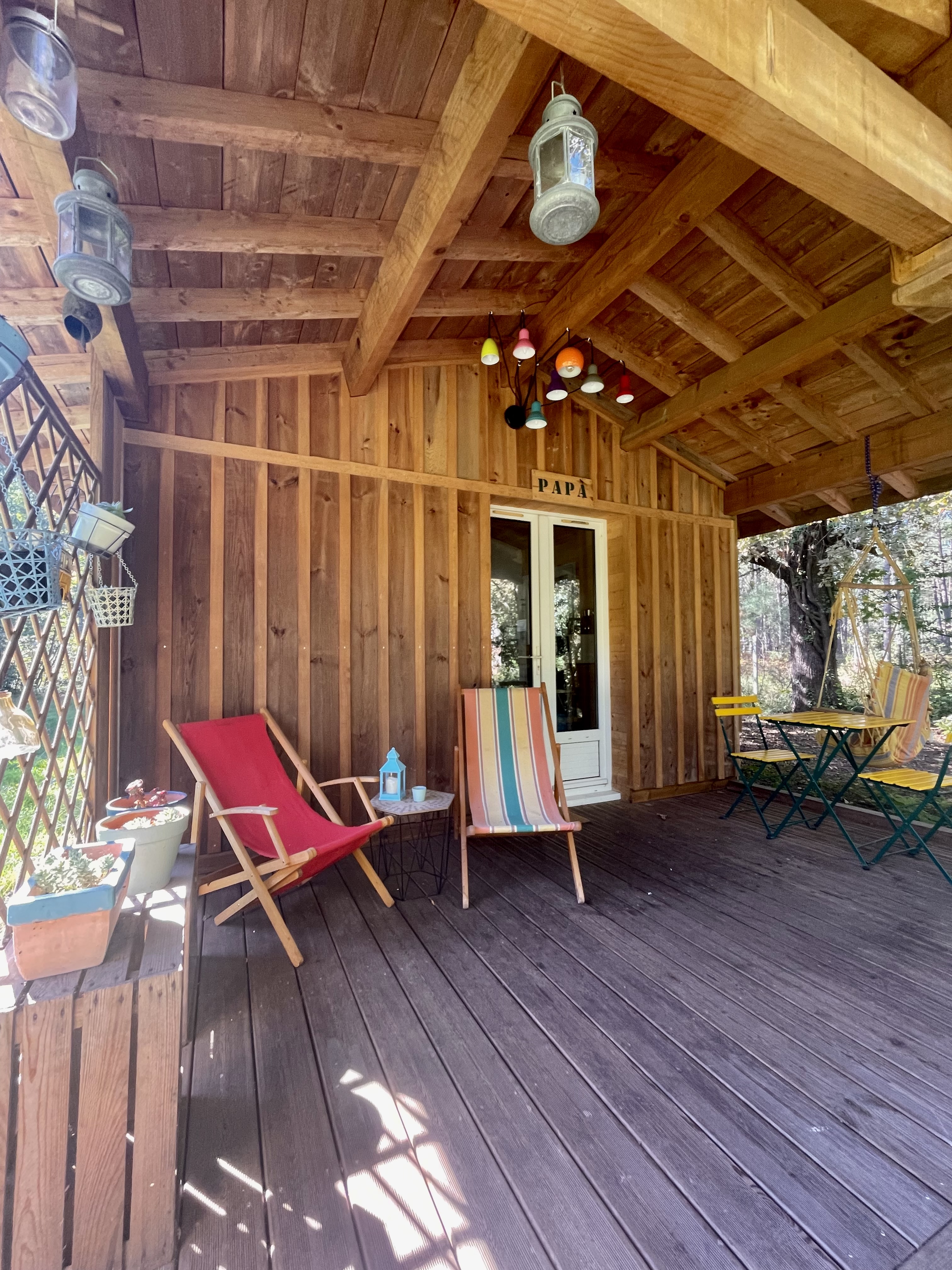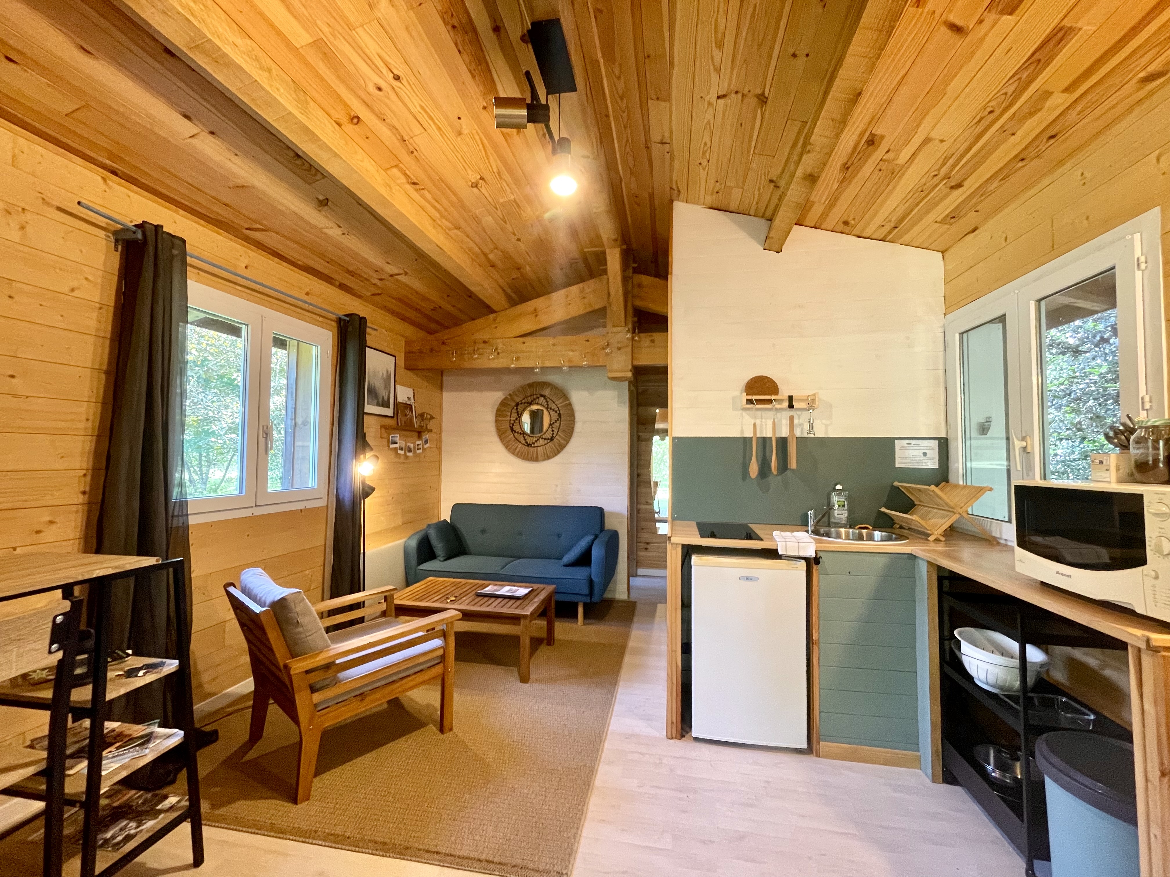 Dans un style bohème chic, le gîte « Papà » bénéficie d’une terrasse tout confort au milieu des arbres pour un séjour estivale nature et reposant mais aussi agréable en automne/hiver avec son salon cocoon et sa kitchenette toute équipée.