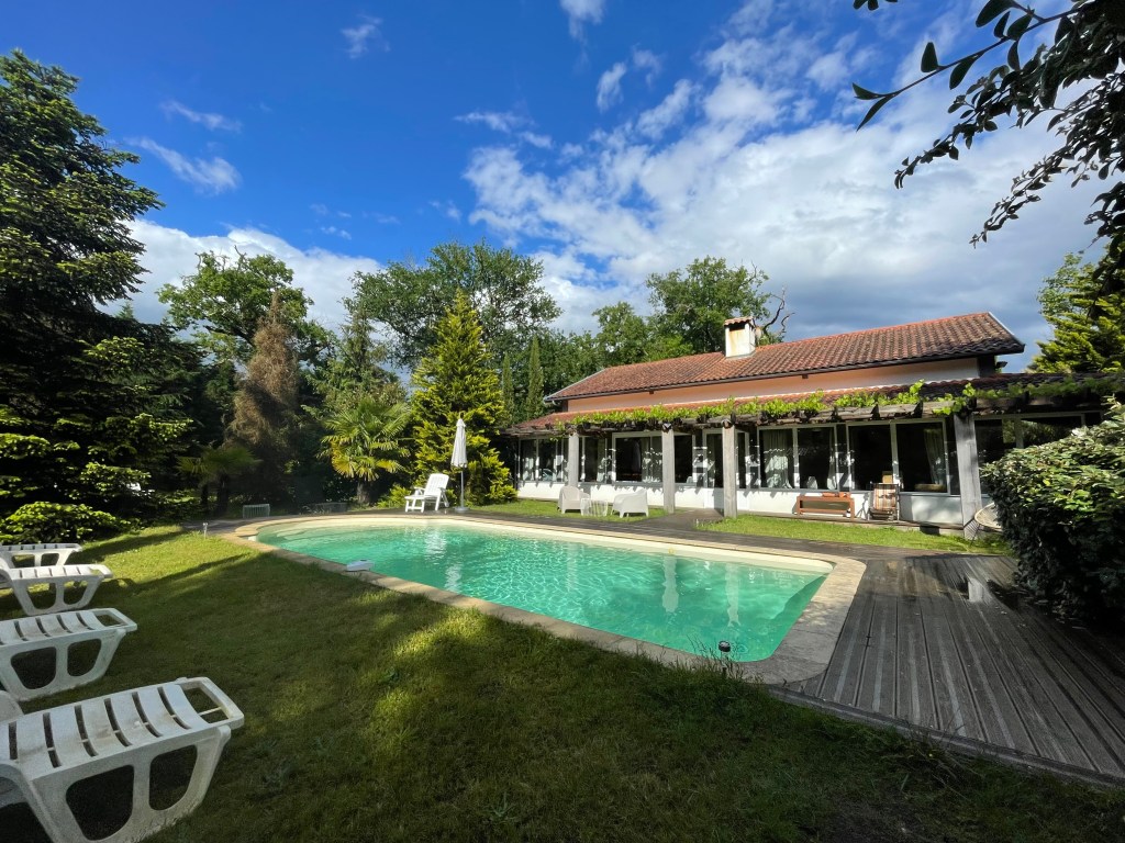 Mélange de style landais traditionnel et contemporain, la villa, situé au milieu d’un parc boisé de 2 hectares entièrement clôturé, fait 180m2.